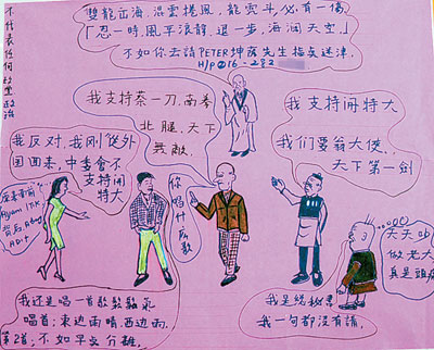 張貼在飲食中心周圍的有關(guān)漫畫大字報顏色非常鮮艷,內(nèi)容都是以“馬華武林大會”、“支持特大”、“翁大使要第一劍”、“中委會不支持特大”、及“雙龍出海,混云卷風,龍虎斗,必有一傷”,及勸人退一步海闊天空等字眼。
