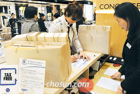 “這個肯定是真貨吧?”韓國首爾新世界百貨商店總店的外國人“退稅(tax refund)”柜臺前擠滿了中國人。一位顧客拿著一塊閃閃發(fā)光的名牌手表給百貨商店的漢語翻譯看并詢問。