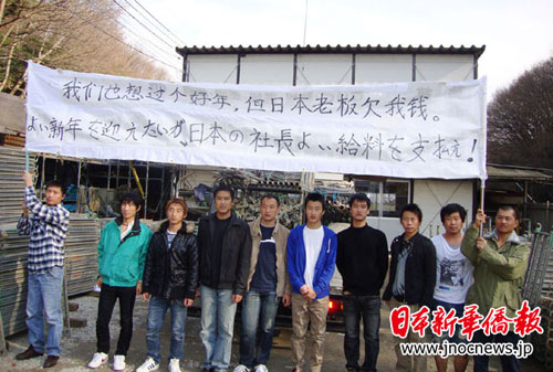 中新網(wǎng)12月31日電 據(jù)日本新華僑報網(wǎng)報道,“我們也想過個好年,但日本老板欠我的錢!”12月30日上午,十名來自東北的在日中國實習(xí)生在他們的住地前打出雙語橫幅,憤怒譴責(zé)他們所在的“健陽”株式會社的日本老板拖欠工資的行為。