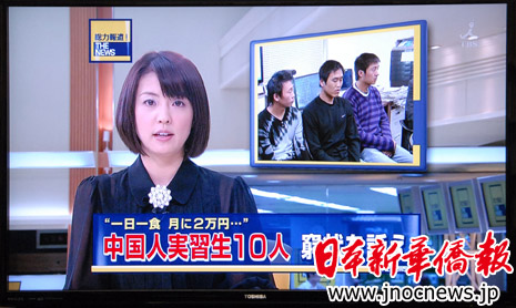中新網(wǎng)1月8日電 據(jù)日本新華僑報(bào)網(wǎng)報(bào)道,在中日兩國(guó)引起強(qiáng)烈反響的十名在日中國(guó)實(shí)習(xí)生“討薪事件”也引起了日本媒體的關(guān)注。1月7日,日本主流媒體TBS電視臺(tái)兵分三路,一路前往十名中國(guó)實(shí)習(xí)生的駐在地采訪,一路找到中國(guó)實(shí)習(xí)生所在的“健陽(yáng)”株式會(huì)社社長(zhǎng)宮地聰采訪,一路找到在《日本新華僑報(bào)》社舉行記者會(huì)見(jiàn)的十名中國(guó)實(shí)習(xí)生采訪。當(dāng)天晚上7點(diǎn)半鐘,TBS電視臺(tái)在黃金時(shí)間段播出這條新聞,引起很大反響。