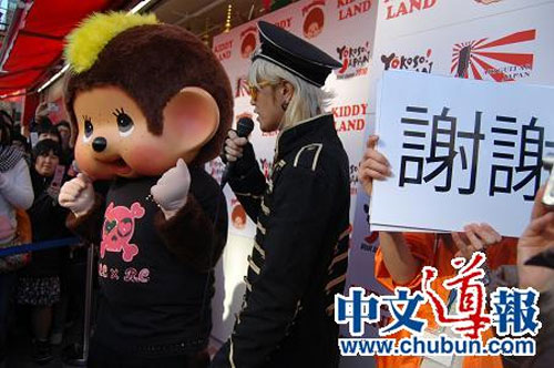 1月30日下午2時,身穿旗袍的主持人小田小姐宣布“Yokoso! Japan year2001年冬季宣傳活動”開始,接著由MAY等“空氣吉他日本”的成員做精彩表演,最后蒙奇奇出場,蒙奇奇的后面有人舉著用中文寫成的展示它的身體語言所表現(xiàn)的意思的牌子,場上氣氛十分熱烈。(張石)
