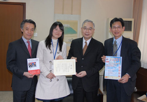 中新網(wǎng)4月15日電 15日下午,日本駐華大使館特命全權(quán)大使宮本雄二在北京親切會(huì)見了第五屆中國人日語征文大賽主辦單位代表、日本僑報(bào)社總編輯兼日中交流研究所所長段躍中和最優(yōu)秀獎(jiǎng)和日本大使獎(jiǎng)得主--青島大學(xué)日語系三年級(jí)學(xué)生郭文娟。