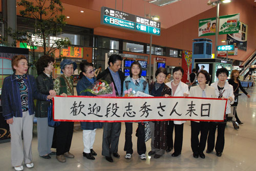 4月19日下午,北川女孩段志秀與李廣宏一起走下飛機(jī),在關(guān)西機(jī)場,在此等候的日本友人向段志秀獻(xiàn)花,并鼓勵(lì)她在日本早日戰(zhàn)勝病魔,段志秀在機(jī)場說:“我要在日本學(xué)習(xí)很多有關(guān)抗震的知識,并打算將來到日本留學(xué)。”(渡邊)