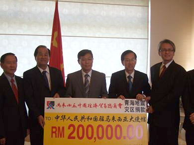 中新網(wǎng)5月6日電 據(jù)中國外交部網(wǎng)站消息,近日,馬來西亞馬中經(jīng)貿(mào)總商會(huì)、馬華公會(huì)公共服務(wù)及投訴局以及華商Yap Kim San 先生前來中國駐馬來西亞使館,轉(zhuǎn)交向青海玉樹地震災(zāi)區(qū)捐款。