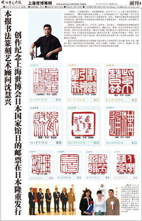 中新網(wǎng)6月12日電 據(jù)日本《關(guān)西華文時(shí)報(bào)》報(bào)道,6月12日是上海世博會(huì)的日本國(guó)家館日,一艘具有著特別意義的按1:1比例復(fù)制的日本“遣唐使船”進(jìn)入世博園區(qū)內(nèi)的黃浦江水域,重現(xiàn)當(dāng)年中日交流的傳奇;同時(shí),該報(bào)書法篆刻藝術(shù)顧問沈慧興創(chuàng)作紀(jì)念上海世博會(huì)日本國(guó)家館日的郵票在日本隆重發(fā)行,共同慶祝上海世博會(huì)日本國(guó)家館日的隆重舉行。