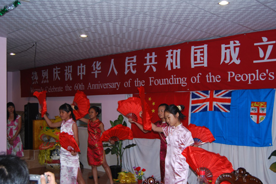 隨著鏗鏘有力的鑼鼓,新獅騰飛起舞,熱情奔放的舞獅表演引來陣陣喝彩;中華學校學生們表演了中華傳統(tǒng)舞蹈—扇子舞和斐濟土風舞,大家對孩子們清新可愛的表演報以熱烈的掌聲;斐濟武術協(xié)會林國錦先生表演的中華拳術、劍術、棍術等多種套路,展現(xiàn)了中華武術的剛健和豪氣。大會還進行了國慶知識有獎競猜、幸運抽獎等活動,內容十分豐富。最后的特別節(jié)目是斐濟華人工商聯(lián)汪戈莉女士獨唱“今天是你的生日”,幾個孩子手推裝載生日蛋糕的小車緩緩上場,燭光裊裊,大家共同為偉大母親六十壽辰祝福,將全場氣氛推上高潮。最后全場起立放聲高歌《歌唱祖國》,整個活動在對祖國的衷心祝福中落下帷幕。