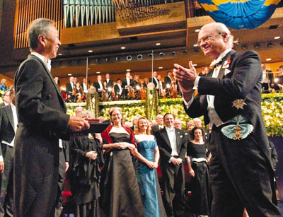 中新網(wǎng)12月11日電 2009年諾貝爾獎頒獎禮昨在瑞典斯德哥爾摩演奏廳舉行,一生獲獎無數(shù)的光纖之父、前香港中文大學校長高錕,正式從瑞典國王古斯塔夫.卡爾16世(Carl XVI Gustaf)手中接過諾貝爾物理學獎。期間大會更為他作出特別安排,由國王走到其座位旁邊頒獎,盛裝出席的他,以燦爛的笑容迎接氣氛莊嚴但歡樂的歷史性一刻。