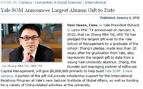 據(jù)耶魯大學(xué)公共事務(wù)辦公室網(wǎng)站1月4日消息,美國(guó)耶魯大學(xué)校長(zhǎng)理查德·萊文教授宣布,耶魯2002屆畢業(yè)生張磊(音)已經(jīng)承諾,將向耶魯大學(xué)管理學(xué)院(SOM)捐贈(zèng)888萬(wàn)8888美元。這是到目前為止,耶魯管理學(xué)院畢業(yè)生捐贈(zèng)的最大一筆個(gè)人捐款。
