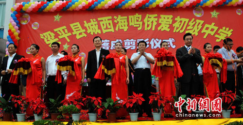 中新網(wǎng)梁平6月21日電 (記者 郭晉嘉)21日,重慶市梁平縣城西海鳴僑愛中學(xué)(原梁平城西中學(xué))竣工落成,國(guó)僑辦副主任馬儒沛、僑愛中學(xué)捐資人屠海鳴等出席落成剪彩儀式。