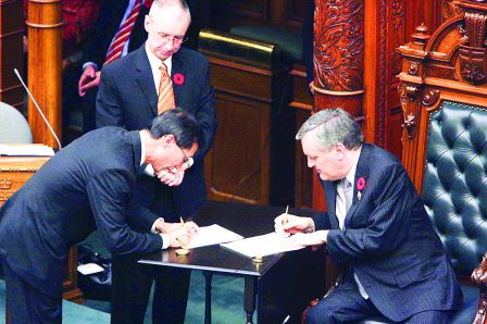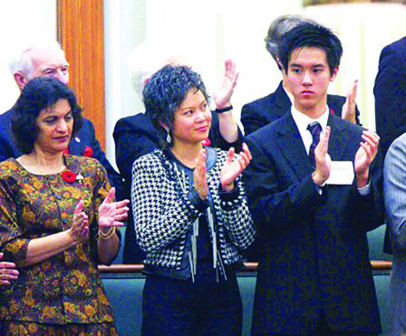 中新網11月1日電 據加拿大《明報》報道,競選連任成功的加拿大安省省長麥堅迪10月30日率領新內閣宣誓就任。華裔省議員陳國治再上層樓,被麥堅迪委以重任,出任安省公民及移民廳廳長,成為安省內閣的一名重要成員。陳國治在宣誓就任的儀式結束后向中文媒體表示,感謝省長給他這個機會,可以為安省的新移民、新公民服務。
