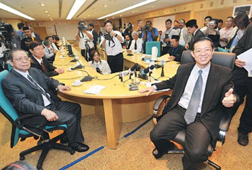 林冠英以檳州首長(zhǎng)身份,第一次在首長(zhǎng)辦公樓召開記者會(huì)。(馬來(lái)西亞《光華日?qǐng)?bào)》圖)