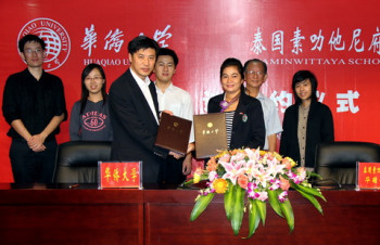 中新網10月27日電 據華僑大學新聞網消息,10月24 日上午,華僑大學與泰國素叻他尼府華萌學校在華大廈門校區(qū)簽署合作備忘錄。華僑大學華文教育辦公室主任趙明光、泰國素叻他尼府華萌學校副經理安蒙麗分別代表雙方在合作備忘錄上簽字。出席簽字儀式的還有泰國素叻他尼府華萌學校校董涂碧泉及華僑大學華文教育辦公室工作人員。