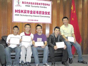 郭凌清、李賦涵、張庭、黃帝鈞、張龍江五位同學,都在去年參加由加拿大多倫多漢語水平考試中心主辦的中國國家漢語水平考試,并取得優(yōu)異成績。4日他們在親友和家長的陪同下,領取國家漢辦孔子學院獎學金證書,并暢談暑期前往中國學習漢語的美妙經歷。