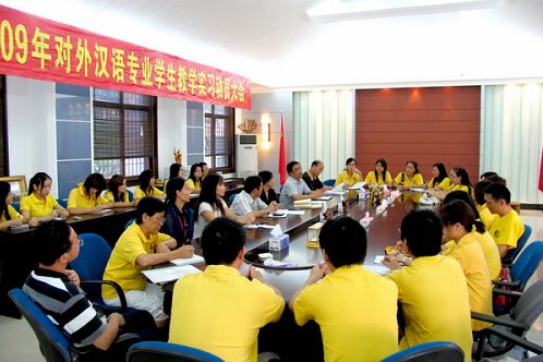 中新網(wǎng)10月10日電 據(jù)華僑大學(xué)華文學(xué)院網(wǎng)站消息,10月9日下午,華僑大學(xué)2009年對(duì)外漢語專業(yè)學(xué)生赴泰國參加“中華文化大樂園”教學(xué)實(shí)習(xí)動(dòng)員會(huì)舉行。華大華文學(xué)院副院長陳旋波、副書記張燈、副院長李曉潔以及5位部門領(lǐng)導(dǎo)和24名對(duì)外漢語專業(yè)學(xué)生參加大會(huì)。