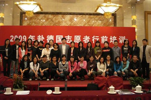 國家漢辦12日為該批志愿者組織了行前培訓(xùn)并為他們送行。志愿者中心主任薛華領(lǐng)勉勵(lì)志愿者們繼承漢語教師志愿者兢兢業(yè)業(yè)、克己奉獻(xiàn)的優(yōu)良作風(fēng),發(fā)揚(yáng)志愿精神,高標(biāo)準(zhǔn)要求自己,做好志愿服務(wù)工作。同時(shí)也希望志愿者們牢記漢語教師志愿者的“光榮感、責(zé)任感、使命感”,進(jìn)一步提高自身素質(zhì),關(guān)心國家大事,在新中國60華誕之際,抓住機(jī)遇,展示祖國的偉大成就,為中德友好交流做出貢獻(xiàn)。志愿者們紛紛表示,祖國的崛起與富強(qiáng)堅(jiān)定了他們當(dāng)好文化傳播民間使者的信心和決心,激勵(lì)著他們投身到漢語國際推廣事業(yè)的最前沿隊(duì)伍中去,把工作做得更好、更精彩。