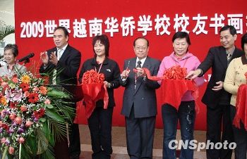 11月17日,2009世界越南僑校校友書畫攝影藝術(shù)展在廣西南寧開(kāi)展。參展的近50幅作品由來(lái)自世界各地的越南僑校校友畫家、書法家創(chuàng)作,包括加拿大溫哥華藝術(shù)家韋長(zhǎng)華、加拿大著名攝影家焦根基等。藝術(shù)展分為油畫、水墨、水彩、書法等種類,內(nèi)容涉及山水花鳥(niǎo)、人物、歷史、古詩(shī)詞等。圖為廣西壯族自治區(qū)僑聯(lián)副主席劉漢祥、加拿大越北華人聯(lián)合總會(huì)主席謝卓裕等嘉賓為藝術(shù)展剪彩。 中新社發(fā) 黃艷梅 攝