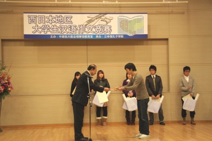 12月20日,中國(guó)駐大阪總領(lǐng)事館教育室在立命館大學(xué)舉行了西日本地區(qū)大學(xué)生中文作文比賽頒獎(jiǎng)儀式。教育室主任劉占山為獲得一等獎(jiǎng)的神戶市立外國(guó)語大學(xué)的渡部恒介同學(xué)頒發(fā)了榮譽(yù)證書和三萬元的圖書卡獎(jiǎng)品。立命館孔子學(xué)院院長(zhǎng)周瑋生為獲得二等獎(jiǎng)的龍谷大學(xué)的北村籃子和關(guān)西外國(guó)語大學(xué)的增瀨有佑同學(xué)頒發(fā)了榮譽(yù)證書和一萬元的圖書卡。獲得三等獎(jiǎng)的同學(xué)有龍谷大學(xué)的韓國(guó)留學(xué)生權(quán)純睦、神戶市外國(guó)語大學(xué)的油谷優(yōu)太、京都外國(guó)語大學(xué)相川瑞穗和神戶松蔭女子大學(xué)的古川翠。