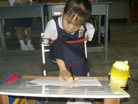 她五六歲在附設(shè)于吉北循正華小的學(xué)前幼兒園開始上學(xué),家人就用特制的畫板式桌子,及舅舅為她度身制作如小童學(xué)步車設(shè)計、用雙腳操縱的小輪椅,每天攜帶這套特別桌椅到學(xué)校讓她和其他小孩一起上課。