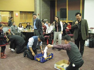成語接龍和逢七數(shù)數(shù)也引爆了全場的笑聲,使全場沸騰的則是游戲“七拼八湊”。游戲中,呂敏偉將與會者分為“左派”和“右派”,要求兩派老師同心同德,以最快速度籌集現(xiàn)場報出的物品。兩派人員總動員,紛紛將手表、錢、書包、鋼筆、口紅等取出,拋進箱子。最令人捧腹的是,有的老師脫下了襪子,獻出了皮帶,最后由右派險勝。當天聯(lián)歡會上到處充滿歡聲笑語,以及對彼此的新年祝福。