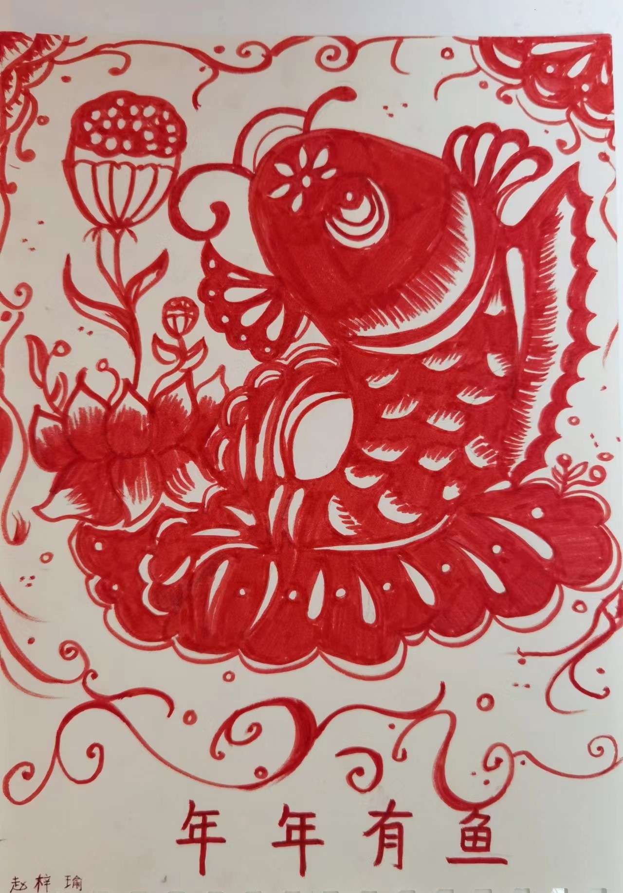 媽媽每年過年時都會在窗戶上貼上不同的剪紙窗花。在今年春節(jié)時,我就畫了一幅剪紙風(fēng)格的年畫,這樣我們就可以一直把它掛在墻上,年年有余。