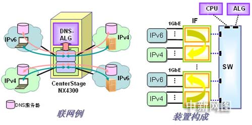 可以在ALG 刀片上搭載將DNS咨詢進(jìn)行IPv6-IPv4轉(zhuǎn)換的ALG功能。與轉(zhuǎn)換服務(wù)器刀片協(xié)作可以實(shí)現(xiàn)IPv6與IPv4的雙方向通信。