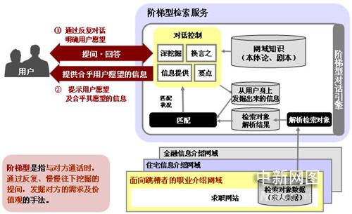 沖電氣與RECRUIT,共同開發(fā)設(shè)計(jì)了通過計(jì)算機(jī)向用戶提問,發(fā)掘用戶獨(dú)自無法表達(dá)的愿望及需求,從各種各樣大量的服務(wù)及內(nèi)容中找出與之匹配信息的“階梯型檢索服務(wù)”。去年本服務(wù)已經(jīng)被“信息大航海項(xiàng)目”作為模型服務(wù)之一所采納,進(jìn)行了圍繞階梯型對話引擎的系統(tǒng)技術(shù)開發(fā),在以約800用戶為對象的向跳槽者介紹職業(yè)的網(wǎng)域進(jìn)行了驗(yàn)證試驗(yàn)。結(jié)果表明,與用戶平均進(jìn)行了33次對話(系統(tǒng)提問,用戶回答后算一次對話),可以平均從用戶獲得32個(gè)屬性的信息。同時(shí)進(jìn)行了問卷調(diào)查,24%的用戶回答通過對話得到了提示,了解了自己的需求,驗(yàn)證了通過與計(jì)算機(jī)對話,能發(fā)掘用戶自身沒有注意的需求。而且,沖電氣還從中獲知可以對該服務(wù)寄予極大期望,期待目前有54%,兩年后有75%的用戶能使用該服務(wù)。