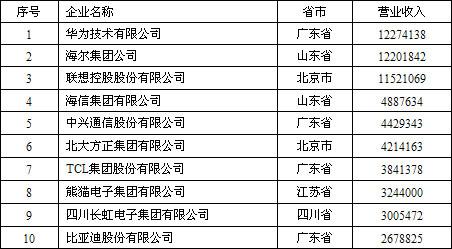 據(jù)資料顯示,華為以年營業(yè)收入1227億元位居榜首,海爾以1220億元位列第二,聯(lián)想以1152億元排在第三。位于第四到第十名的企業(yè)分別是:海信、中興、北大方正、TCL、熊貓電子、四川長虹、比亞迪。