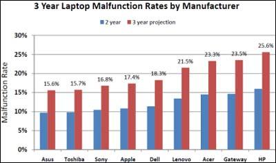 報(bào)告顯示,在三年時(shí)間內(nèi),華碩筆記本出現(xiàn)硬件故障的比例最低,僅為15.6%。東芝位居第二,故障率為15.7%。索尼第三,故障率為16.8%。蘋果第四,故障率為17.4%。戴爾第五,故障率為18.3%。聯(lián)想第六,故障率為21.5%。宏基第七,故障率為23.3%。Gaeway第八,故障率為23.5%;萜盏诰牛收下蕿25.6%。