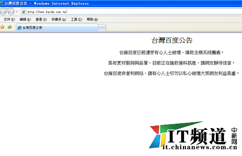 臺(tái)灣百度發(fā)布的公告稱:“臺(tái)灣百度日前遭受有心人士破壞,導(dǎo)致主機(jī)系統(tǒng)癱瘓。為有更好服務(wù)與質(zhì)量,目前正在搶救數(shù)據(jù)訊息,請(qǐng)網(wǎng)友靜待佳音。臺(tái)灣百度非營(yíng)利網(wǎng)站,請(qǐng)有心人士切勿以私心破壞大眾網(wǎng)友利益為重。”