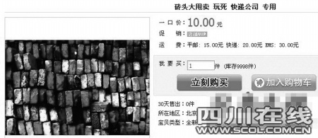 隨后,記者在淘寶上搜索,發(fā)現(xiàn)了近20家“磚頭大甩賣”的網(wǎng)店。店家在產(chǎn)品詳情上都寫著“磚頭大甩賣,玩死快遞公司專用”等字樣。記者發(fā)現(xiàn),這些網(wǎng)店大多以經(jīng)營其他商品為主,“賣磚頭”只是副業(yè)。只有極個別的店鋪里“只賣磚頭”,但是除了幾十個瀏覽記錄外,并沒有人購買。