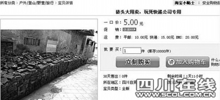 近日,店主“千尋kission”在淘寶網(wǎng)上發(fā)布了“磚頭大甩賣,玩死快遞公司專用”的銷售標題,表示將以5元一斤的價格販賣磚頭。其中的產(chǎn)品說明還頗有幾分《武林外傳》中呂秀才的風采:“泄憤也可用磚頭,本磚頭專為對付那些服務(wù)態(tài)度不好的快遞送貨員設(shè)計,如果你們對那些惹您生氣的快遞員投訴無門,無處泄憤請拍下此產(chǎn)品!