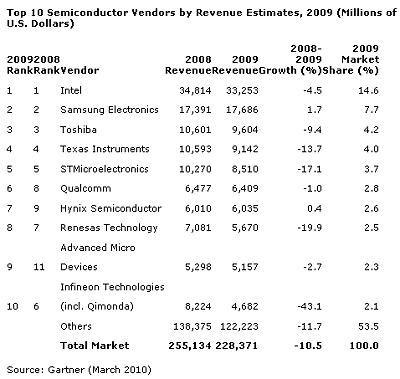 報告顯示,英特爾仍是全球最大半導(dǎo)體廠商,市場份額從2008年的13.6%增至14.6%,這已經(jīng)是英特爾連續(xù)18年高居該排行榜榜首。