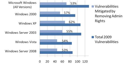 報告稱,取消Windows 7管理員權(quán)限,去年發(fā)現(xiàn)的全部Office漏洞都可以被避免,94%的IE漏洞可以避免,100%的IE 8漏洞可以避免,64%的所有微軟產(chǎn)品漏洞可以避免。