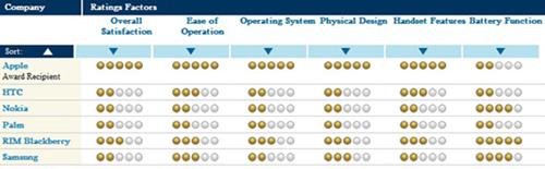 最終,iPhone的整體滿意度為滿分5分。相比之下,RIM整體滿意度為3分,而諾基亞、三星、Palm和宏達(dá)電的整體滿意度只有2分。