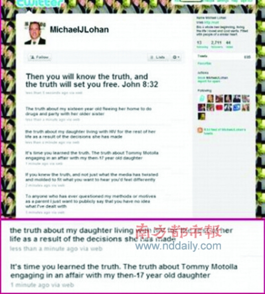 27日,林賽·羅韓的父親邁克爾·羅韓在Twitter稱女兒染上艾滋病,還說(shuō)她17歲時(shí)曾與瑪莉亞·凱利的前夫Tom myMottola有染。邁克爾說(shuō),林賽現(xiàn)在的行徑如此荒唐,完全是因?yàn)榈昧税滩,因此她決定就這樣渾渾噩噩過(guò)一生!但很快邁克爾卻突然將消息撤下,聲稱自己的Twitter網(wǎng)頁(yè)被黑客入侵,網(wǎng)頁(yè)上所言都不是事實(shí)。事后有網(wǎng)友調(diào)查,發(fā)覺(jué)他的網(wǎng)頁(yè)沒(méi)有被入侵,證實(shí)他在說(shuō)謊。