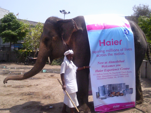 中新網(wǎng)4月8日電 在印度,大象是吉祥之物。日前,在印度著名的旅游城市艾哈邁達(dá)巴德的街頭,一頭背上馱著海爾宣傳畫的大象,氣宇軒昂地穿梭在繁華的街市,為新開業(yè)的海爾體驗店助威宣傳。這種宣傳方式別出心裁,吸引了很多印度消費者來到海爾體驗店體驗海爾全系列高端差異化產(chǎn)品。