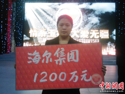中新網(wǎng)4月21日電 4月20日,由中宣部、國家廣電總局、民政部、中國紅十字會主辦,中央電視臺承辦的《情系玉樹 大愛無疆--抗震救災(zāi)大型募捐活動特別節(jié)目》在中央電視臺現(xiàn)場直播。海爾集團(tuán)在現(xiàn)場向災(zāi)區(qū)捐款1200萬元,全力支持災(zāi)區(qū)緊急救災(zāi)和災(zāi)后重建工作。