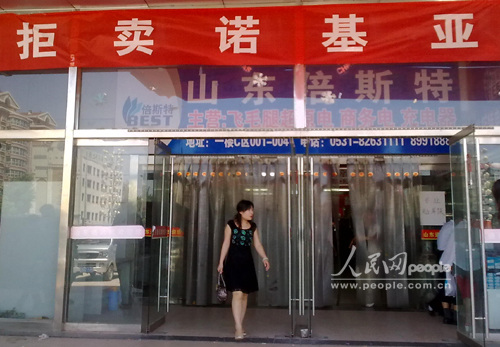 諾基亞與經(jīng)銷(xiāo)商的矛盾持續(xù)發(fā)酵,迅速在全國(guó)各地蔓延。繼杭州經(jīng)銷(xiāo)商抗議諾基亞對(duì)竄貨課以重罰,打出要求諾基亞歸還血汗錢(qián)的橫幅后,今天山東諾基亞經(jīng)銷(xiāo)商再度發(fā)飆,在濟(jì)南市場(chǎng)山東通訊城打出《拒賣(mài)諾基亞》的條幅。