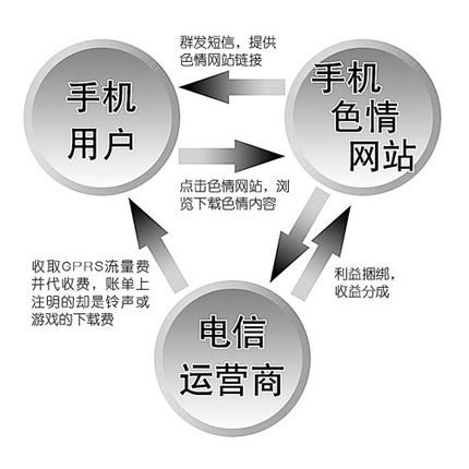 “簡(jiǎn)單來說,一條手機(jī)色情信息內(nèi)容的發(fā)布,一般要經(jīng)過三個(gè)環(huán)節(jié):運(yùn)營(yíng)商(主要是指各種手機(jī)圖片、鈴聲、視頻、文字、游戲等內(nèi)容發(fā)布平臺(tái)和渠道的提供者)、SP和WAP網(wǎng)站!北本┼]電大學(xué)一個(gè)曾長(zhǎng)期關(guān)注移動(dòng)增值業(yè)務(wù)的人透露,“SP在運(yùn)營(yíng)商和WAP網(wǎng)站間牽線搭橋,三者已形成捆綁各方的利益鏈,一旦獲利,三方都有收益!