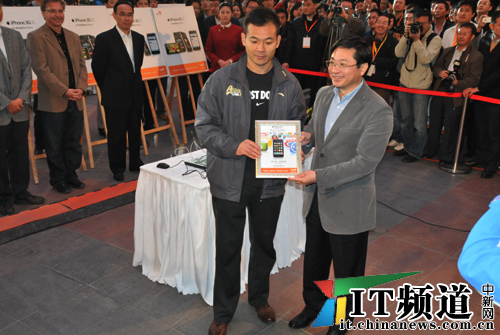 中新網(wǎng)10月30日電 下午6點(diǎn),中國聯(lián)通iPhone手機(jī)正式在中國市場發(fā)售。中國聯(lián)通副總經(jīng)理李剛現(xiàn)場售賣第一臺iPhone,同時中國聯(lián)通高層向現(xiàn)場購得手機(jī)的第一位機(jī)主頒發(fā)證書。