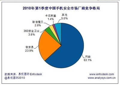 在國內的手機安全廠商中,網秦以63.1%的市場占有率名列第一,信安易占23.9%名列第二,360安全衛(wèi)士擁有3.8%的市場占有率名列第三。