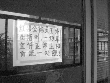 門(mén)上貼著一張告示,“紅果全體員工外出培訓(xùn),一切事宜待正常上班后統(tǒng)一處理”。記者透過(guò)玻璃看到,該公司的辦公用品還在。