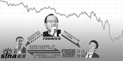 呂伯望給記者粗算了一下,復(fù)星國際在分眾傳媒中13.33%的股權(quán),如果換到增發(fā)后的新浪,也就能拿到5%左右的股權(quán),而在此前,連掌握了新浪18%股權(quán)的盛大CEO陳天橋都沒能進(jìn)入新浪董事會(huì)。