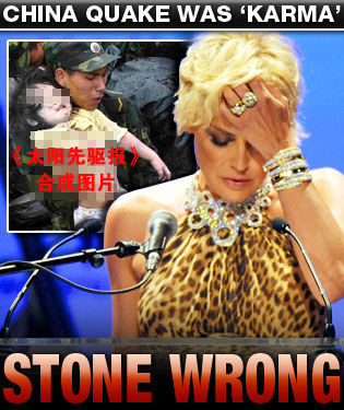 莎朗斯通那些違反人類道德的言論,遭遇全民譴責(zé)。西安的一些音像店昨日已將與她有關(guān)的作品下架,其網(wǎng)絡(luò)下載電影也遭到網(wǎng)友抵制。記者還發(fā)現(xiàn),在一些美國(guó)網(wǎng)站上,美國(guó)網(wǎng)友也展開了對(duì)她的批判。