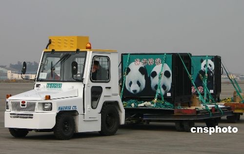 12月23日13時40分,成都雙流國際機場,工作人員正將贈臺大熊貓“團團”“圓圓”運上臺灣長榮航空公司的載運專機。中新社發(fā) 霍潺 攝