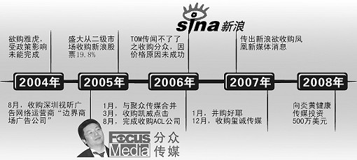 盡管新浪有可能通過這樣的整合實現(xiàn)廣告的打包營銷和交叉銷售,但資本市場的表現(xiàn)似乎卻表達了不同意見。并購消息一出,新浪股價周一在納斯達克市場常規(guī)交易中暴跌4.99美元,跌幅為17.07%,報收于24.25美元。分眾傳媒股價周一報收于9.20美元,較上一交易日下跌1.78美元,跌幅16.21%。