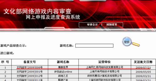 中新網(wǎng)7月21日電 今天,根據(jù)文化部網(wǎng)絡(luò)游戲查詢(xún)系統(tǒng)網(wǎng)站()上的信息顯示,由上海網(wǎng)之易網(wǎng)絡(luò)科技發(fā)展有限公司引進(jìn)的網(wǎng)絡(luò)游戲《魔獸世界》正式通過(guò)審批,批號(hào)為文網(wǎng)進(jìn)字[2009]006號(hào),批文送發(fā)時(shí)間為2009年7月21日。