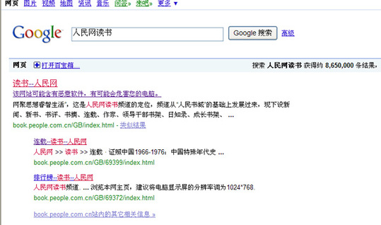 這兩天,你如果通過(guò)谷歌檢索“人民網(wǎng)讀書頻道”,檢索結(jié)果里會(huì)發(fā)現(xiàn)這樣的提示:“該網(wǎng)站可能含有惡意軟件,有可能會(huì)危害您的電腦!