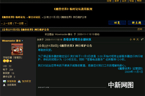 記者登陸《魔獸世界》中文官網(wǎng)臨時論壇發(fā)現(xiàn),網(wǎng)易已于昨晚發(fā)布《魔獸世界》例行維護公告,公告稱,為了保證服務(wù)器的穩(wěn)定運行,將于11月3日凌晨 3:00 開始對現(xiàn)有全部服務(wù)器進行例行維護,停機時間預(yù)計為12小時左右。同時“客服電話服務(wù)”也將暫停12小時。