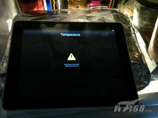 引自:“PC Magazine編輯Zach Honig在twtter” 他帶著他全新的iPad在紐約市出外曬太陽(前幾天紐約市的氣溫都超過攝氏20度左右),十分鐘后iPad就出現(xiàn)了“iPad需要降溫后才能使用”的信號然后關(guān)機(jī)。Honig把他的iPad放進(jìn)冰箱中,然后幾分鐘后iPad就回復(fù)正常了。